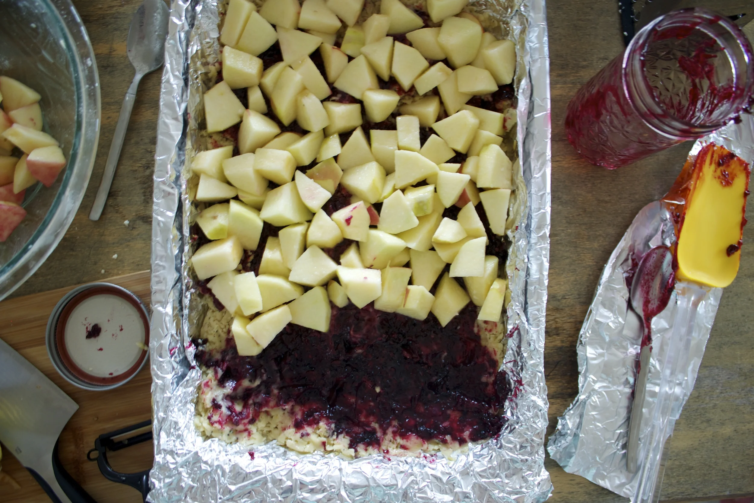 10. Spoon the jam over the first layer of shortbread dough and distribute the apple chunks in one layer on the jam.
