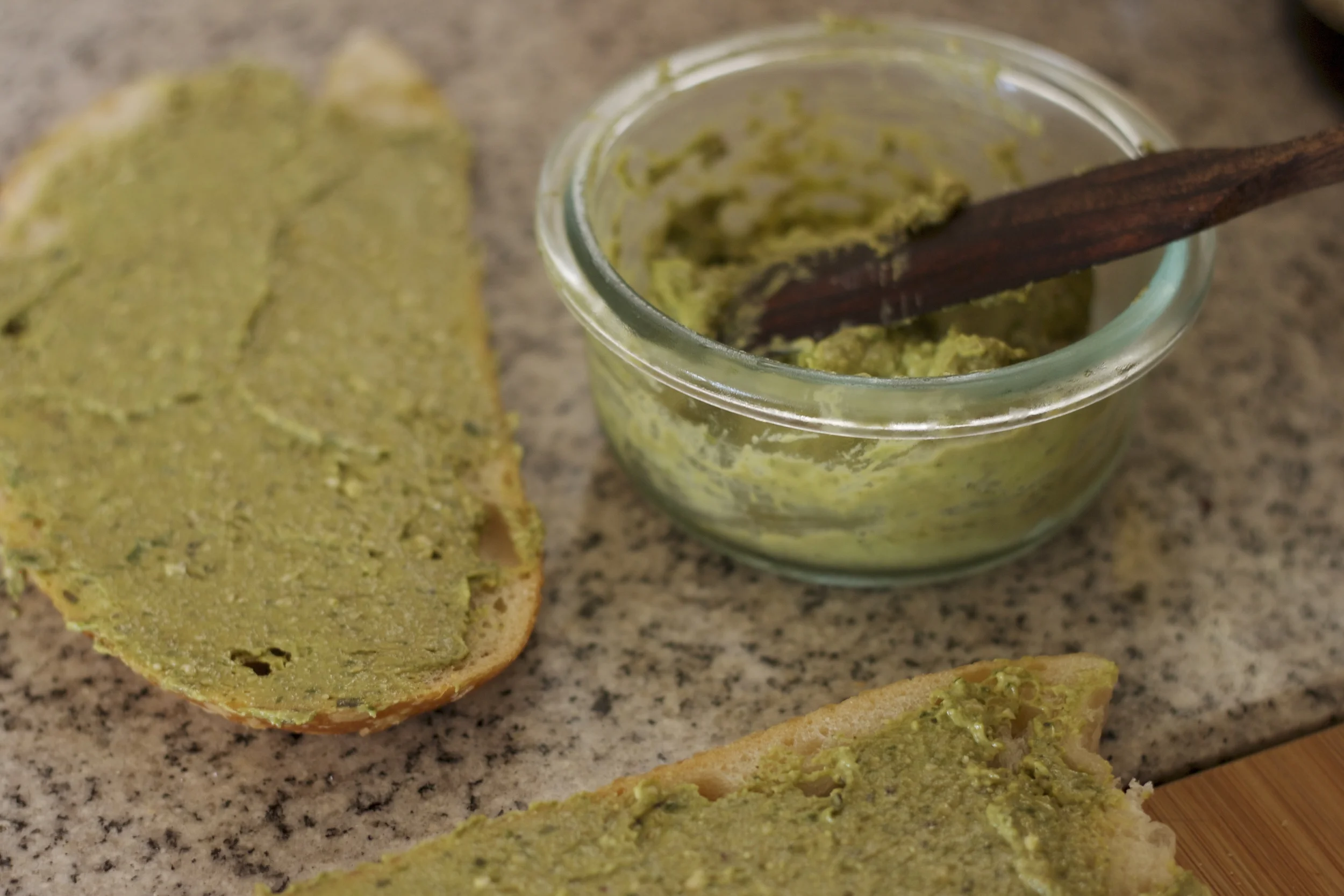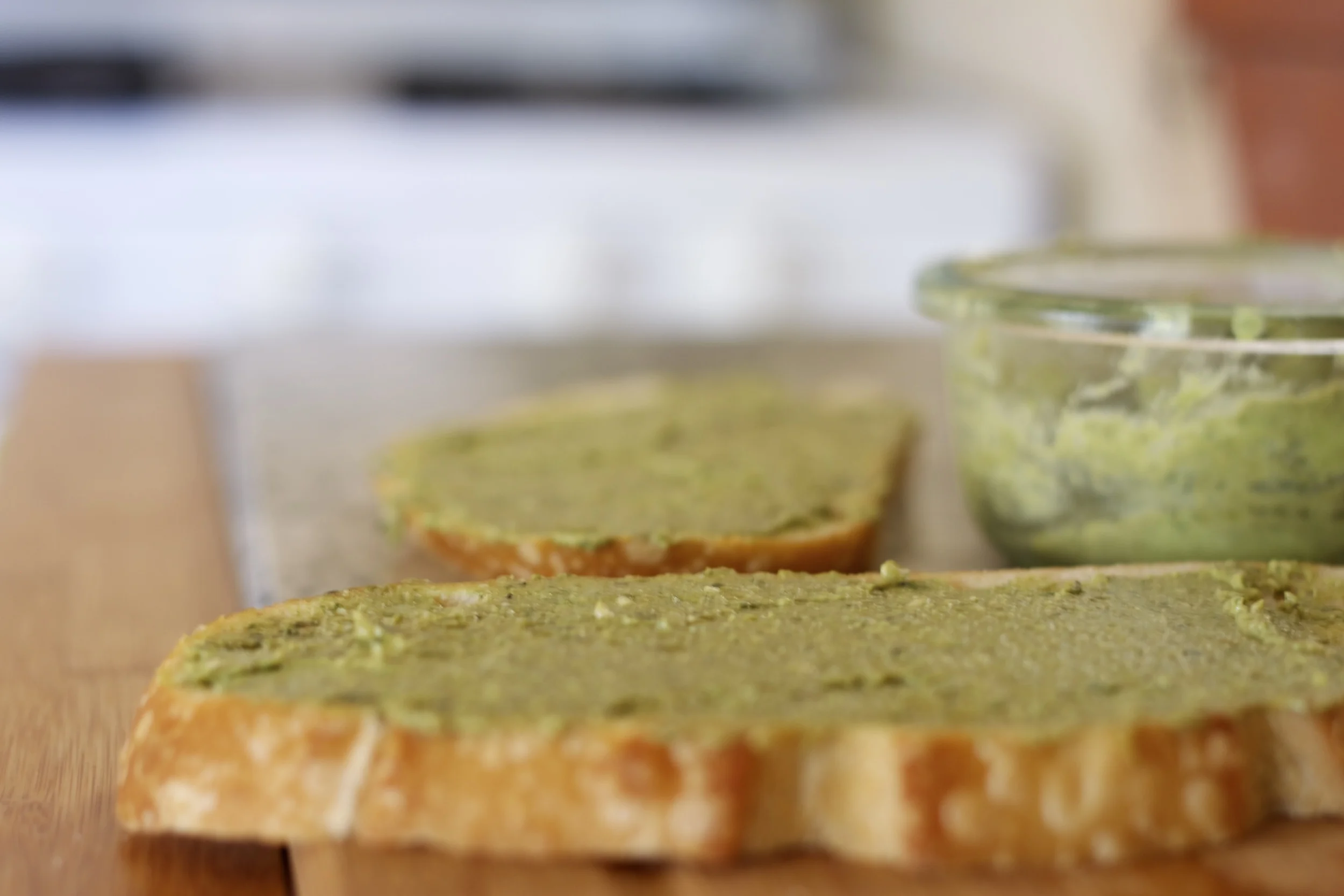 My husband and I love pesto; it makes everything (well, a lot of things) taste absolutely delectable. A while ago while searching through the fridge for something yummy for lunch it dawned on me that what I wanted most was a sandwich smothered in that basilly (not a word), heavenly schmeer. Unfortunately the odds were against me, and I was short on ingredients, even so, nothing could stop me from getting that delicious green spread!