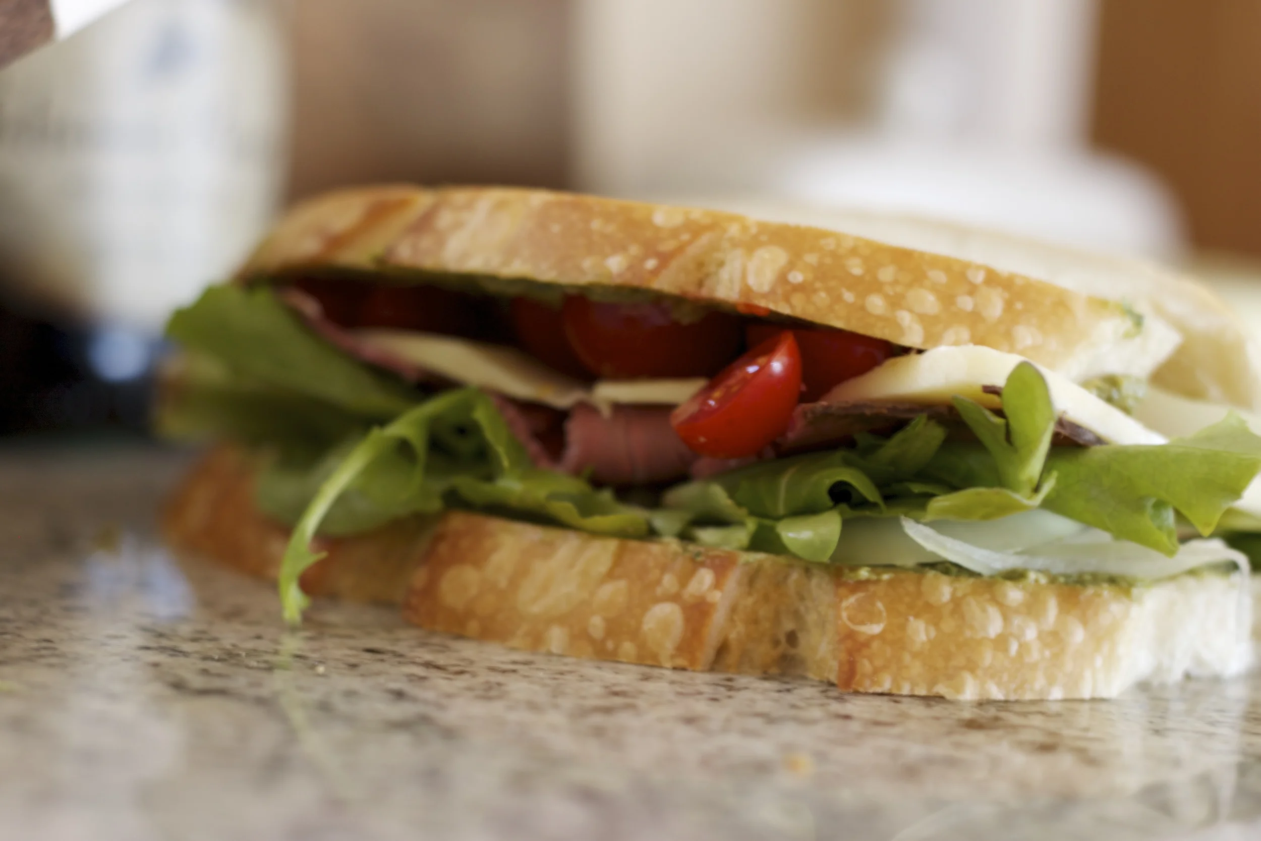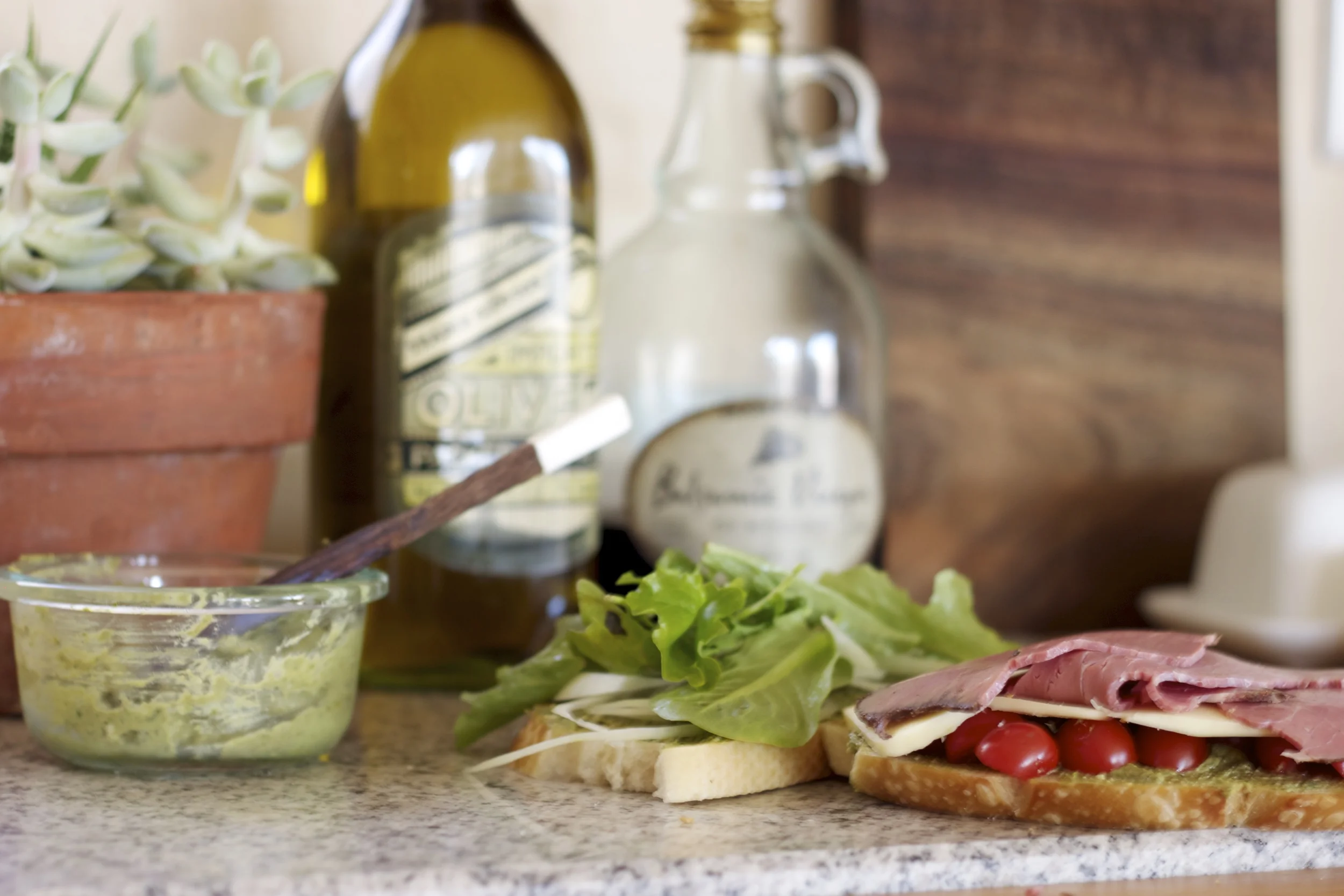To my wonderful surprise I had created something better than I could have ever imagined. It had all the flavor of pesto but it was lighter and creamier, and after distributing a hefty portion to my bread and layering on the meats, veggies and cheeses, it only seemed right to finish it off with a nice grill on the stove.
